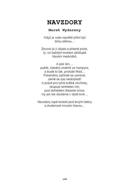Výstižným veršem jednoho z autorů k básnické sbírce skupiny, kterou jsem měl tu čest potkat v jednom už notně pozměněném podniku na malém fláku země u polských hranic. Ale nenechte se zmást, nejde o grupu regionálních básničkářů plkajících o svých rodných vískách, ne, jestli chci v této volné sbírce něco z jejich tvorby zachytit, je to jejich nesourodost, konflikt, avšak i podobnost a doplnění se. Naivní dětská radost tepající vedle cynického dospělého pragmatismu, ale ve skřípajícím spojenectví proti beznadějnému zoufalství a bezskrupulózní sobecké agresi! Že takový koktejl přeci nemůže v rámci jedné básnické skupiny fungovat? Tak se přesvědčte, jak dynamické to může být!