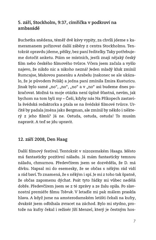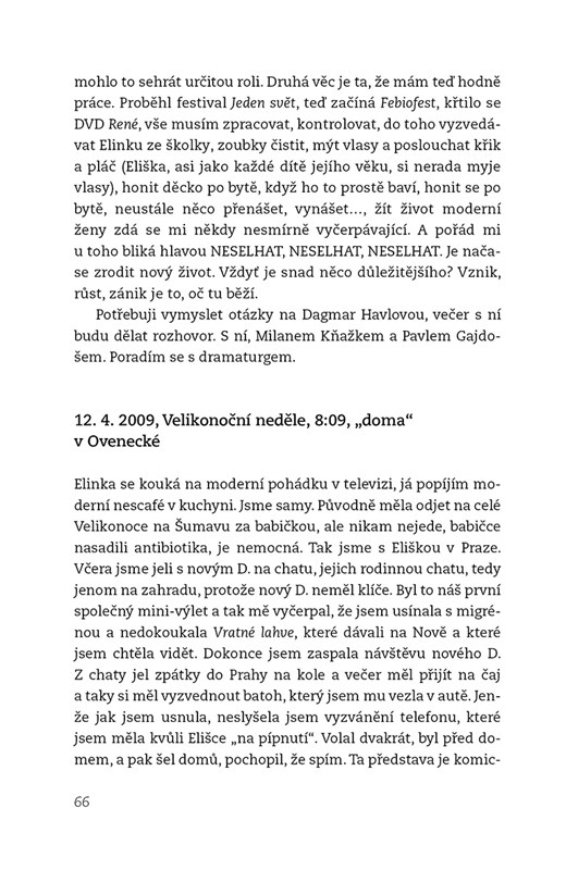 Když před lety ukončila dlouholetý vztah a zůstala sama s malou dcerou, rozpadl se jí malý vesmír. Pomocnou ruku v období plném sebelítosti jí podala nová práce a také nový muž, ale ani on jí často nebyl dost dobrý. V době pochybností, jestli je na správné cestě, jí pomáhal deník. Ten si psala od září do září v dopravních prostředcích nebo v nově nalezeném útočišti – pátém patře bez výtahu. A tak vznikl osobní materiál, často úsměvný a sarkasticky humorný. A někdy také smutný, ostatně – jako život sám.