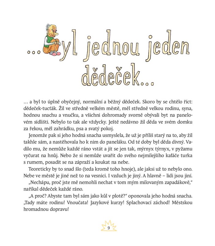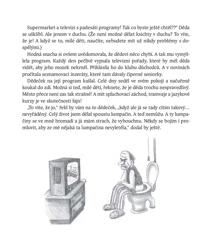 Byl jednou jeden docela obyčejný dědeček, který si poklidně žil ve své chaloupce, pil turka s rumem, čural na hnůj a nic mu nescházelo. Až do chvíle, kdy ho hodná snacha přestěhovala, prý pro jeho dobro, z venkova k nim do městského paneláku. V tom okamžiku se z něj stal dědeček neobyčejný, který celé městečko obrátil vzhůru nohama. V té panelákové šedi se totiž cítil tak nějak… nevyřáděný. A tak si vzpomněl na své dětství a začal dělat všechno to, co tak rád dělával jako malý kluk – sáňkovat na aktovce, hrabat se na smetišti, pouštět vánoční kapry zpátky do řeky, chodit v noci na hřbitov a podobně. Akorát že každá jeho akce nabrala trochu nečekaný spád…