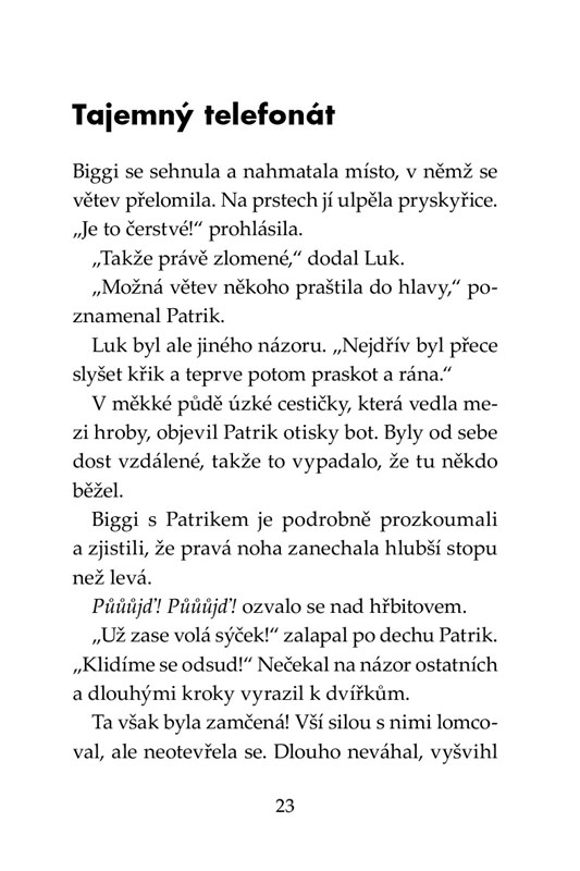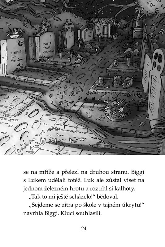 Tajný vzkaz vyláká kamarády z Klubů Tygrů v noci na hřbitov. Když se mezi náhrobky zjeví postava upíra, pořádně je to vyděsí. Tygři se stáhnou do bezpečí, ale příhoda jim nedá spát. Vrátí se na hřbitov ještě jednou, ale tentokrát se jim do cesty připletou další záhadné postavy celé v černém a začnou je pronásledovat a ohrožovat. Přijdou Biggi, Luk a Patrik celé věci na kloub, nebo na hřbitově opravdu straší?