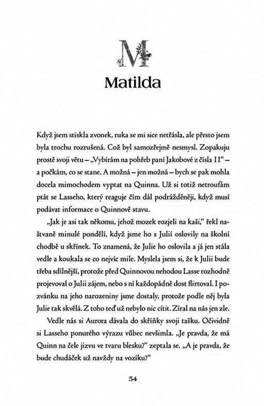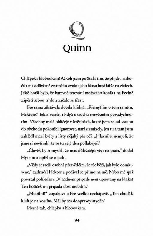 Quinn je cool, chytrý a oblíbený. Matilda pochází z nenáviděné sousedovy rodiny, má zálibu ve fantasy románech a rozhodně není jeho typ. Když je však Quinn jedné noci pronásledován a vážně zraněn strašidelnými bytostmi, vidí věci, které nemohou být z tohoto světa. Jenomže komu se můžete svěřit, když sochy najednou mluví ve špatných rýmech a lebky kostlivců se na vás důvěrně šklebí? Nejlépe holce odnaproti, která je vám úplně ukradená. Quinn neplánoval, že se s Matildou vrhnou do kouzelného dobrodružství plného nebezpečí. A už vůbec ne, že se bláznivě zamiluje...
