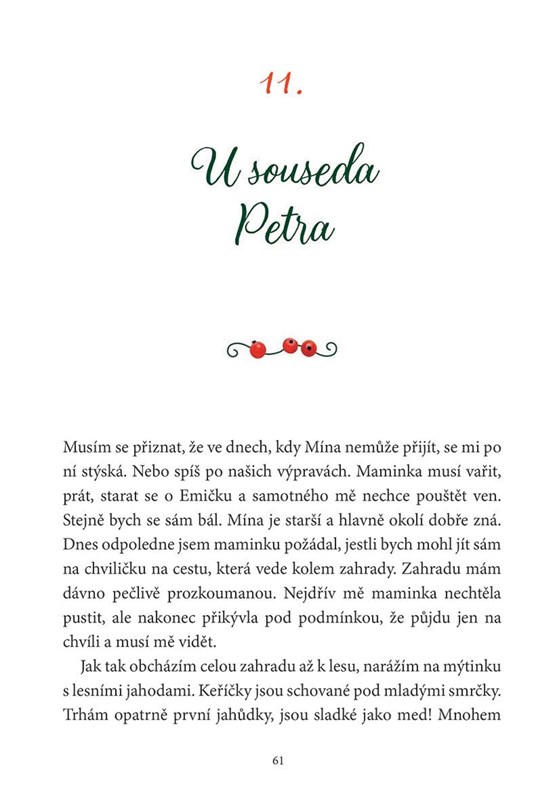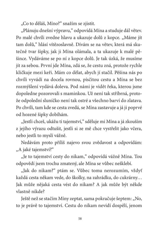 Brzy se tu seznámí s holčičkou Mínou. Ta má bujnou fantazii, chodí bosa a v okolí se vyzná. Cyrilek se postupně učí odvaze a nachází v nové kamarádce někoho, komu důvěřuje a koho má rád. Mína ho seznámí také se svou babičkou, která žije v roubence, kde to voní ovocem a bylinkami. Děti spolu podnikají výpravy do okolních zahrad a lesů, vydají se se sousedem Petrem na ryby nebo večer na kopec pozorovat hvězdy…
