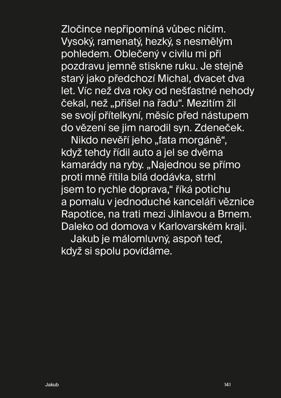 „Na tohle vám nechci, promiňte, nic odpovědět. To se prostě nedělá. Já sice jsem šestý rok v kriminálu, ale žiju. On taky žije, ale… Snad si nemyslíte, že mě není líto toho ‘poškozeného’, celé jeho rodiny? Je a strašně.“