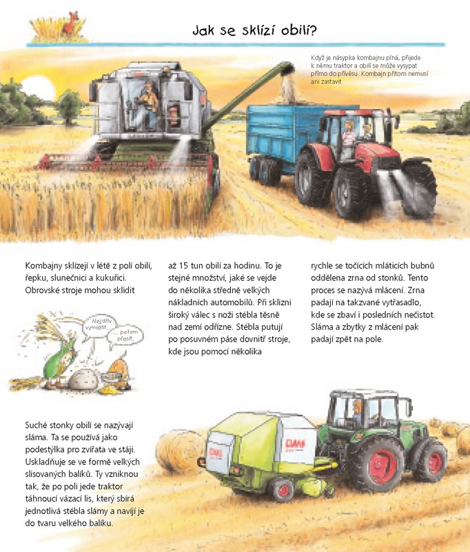 Další kniha z populární edice Už vím proč? zavede dětského čtenáře na venkov a do problematiky zemědělské výroby. Kombajny, traktory, secí stroje nebo nakladače a další zemědělské stroje sice přilákají hlavně kluky, ale informace, co vše je nutné v průběhu roku na statku nebo farmě udělat, abychom měli co jíst, by mohly být zajímavé i pro děvčata.