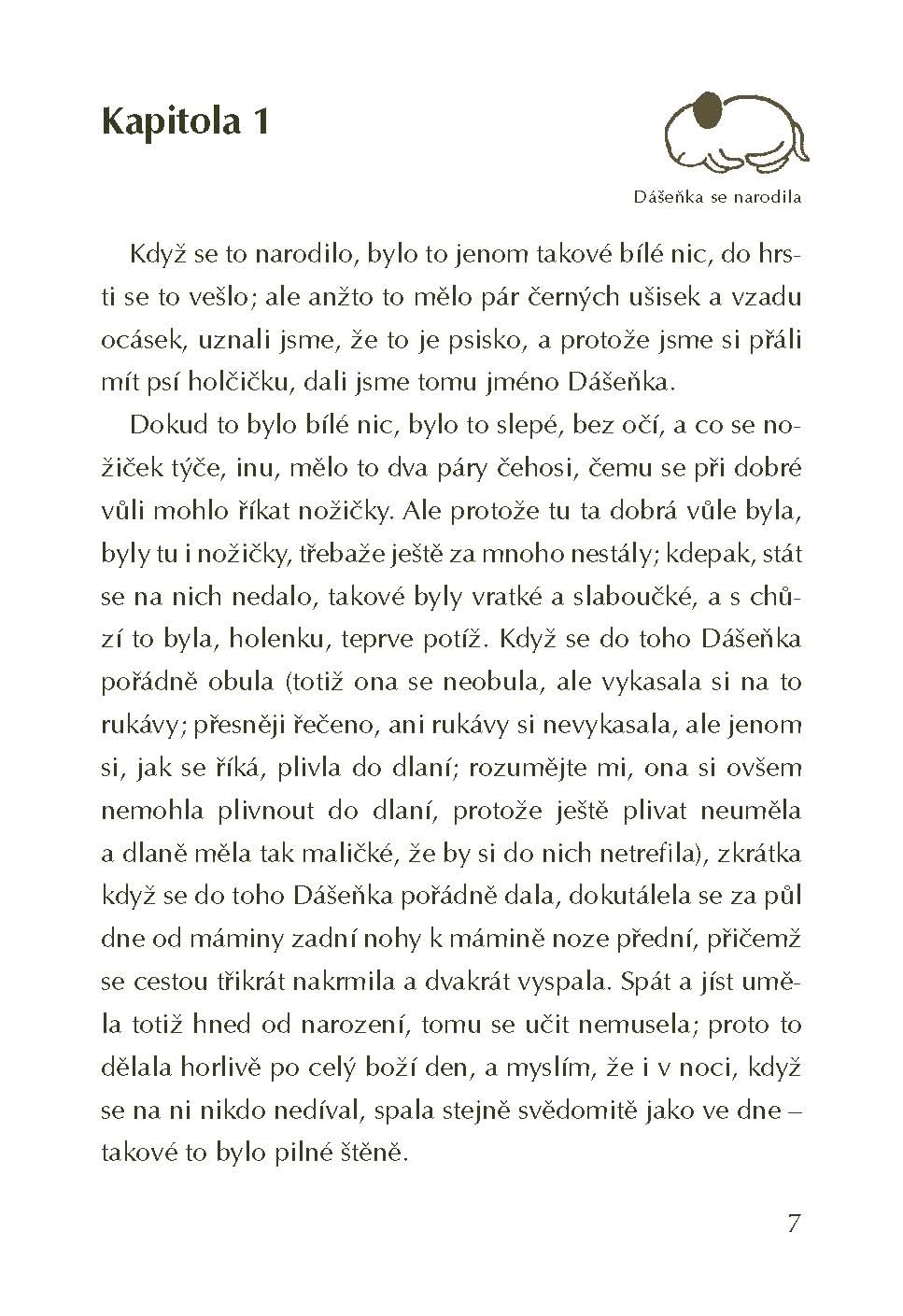 Dášeňka byla nejdříve takové úplně malé bílé nic, ale pila, spala, hrála si, kousala, zvědavost jí nedala, aby nezkoumala okolí, a tak se z roztomilého štěněte postupně vyklubala slečna Dáša.