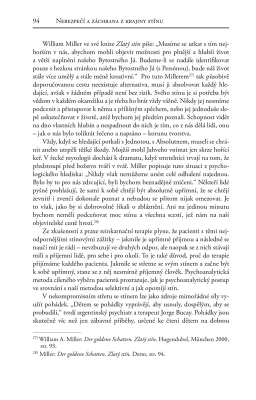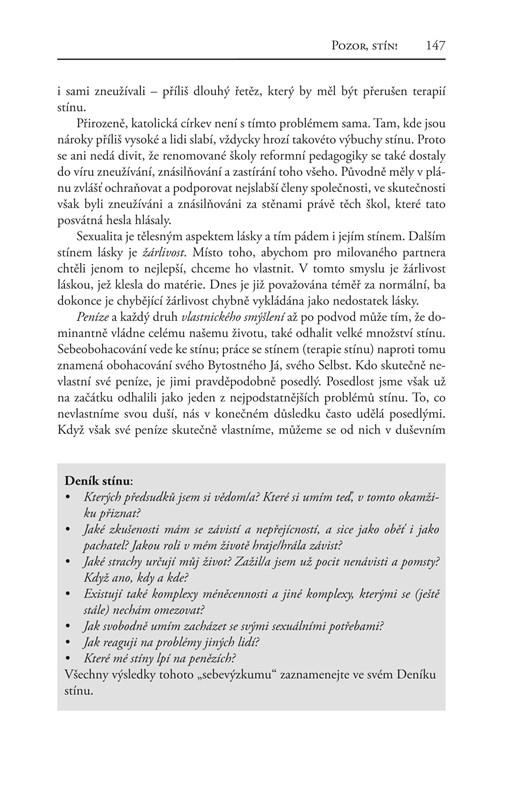 Podle učení Carla Gustava Junga je stínem naše podvědomí. Je to ta osobnost, jíž bychom nejraději nebyli, ale kterou se nakonec stát musíme, chceme-li být celiství. Svůj stín, tedy svou „temnou stránku“, prociťujeme velmi ambivalentně: je nám protivná, ale zároveň nás fascinuje. Práce se stínem slouží k tomu, abychom se stali vědomými, a je tedy v pravém slova smyslu prací se světlem. Stín je vlastně naším pokladem, obohacuje nás tak jako máloco jiného. Vycházeje ze zákona osudu a pravidel hry života, odpovídá nejdůležitějšímu zákonu: zákonu polarity. Můžeme jej projektovat na druhé – anebo můžeme s jeho pomocí a spolu s ním osobnostně růst.
