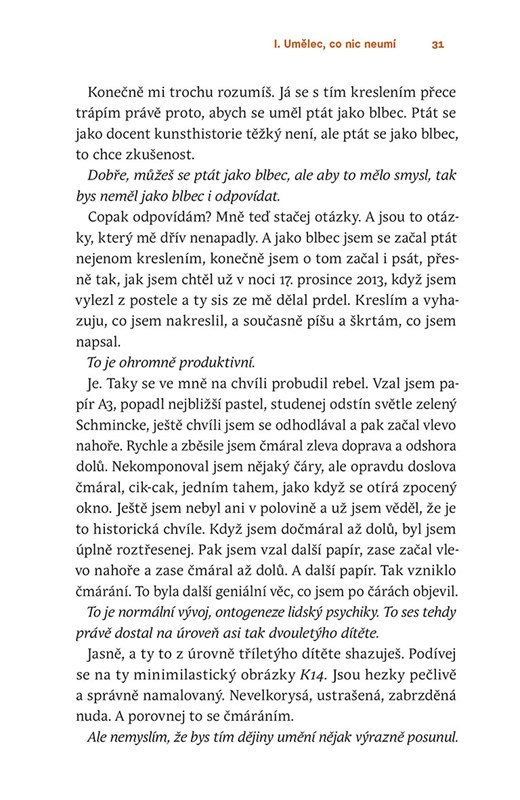 Michael Třeštík o umění nejen píše, ale také ho sám tvoří. Po encyklopediích, v nichž výtvarná díla a architekturu zpřístupnil rodičům i dětem, se pouští do vlastní tvorby. A to samozřejmě s nadsázkou a ironií. Na jedné straně tak stojí jako snaživý autor, na druhé je sám sobě tím nejpřísnějším a nejjedovatějším kritikem. Michael Třeštík prožívá proces tvoření na vlastní kůži, zpochybňuje svoje pokusy a snaží se dospět k uspokojivému výsledku. Autor píše, škrtá, kreslí a maže. Výsledkem je kniha zachycující jeho vývoj od prvních naivních počinů po nepodbízivá díla i snahu vyjádřit se vedle slov také obrazově skrze pastely. Jak je vidět, pro odborníka přes umění není nic náročnějšího než sám umění tvořit.