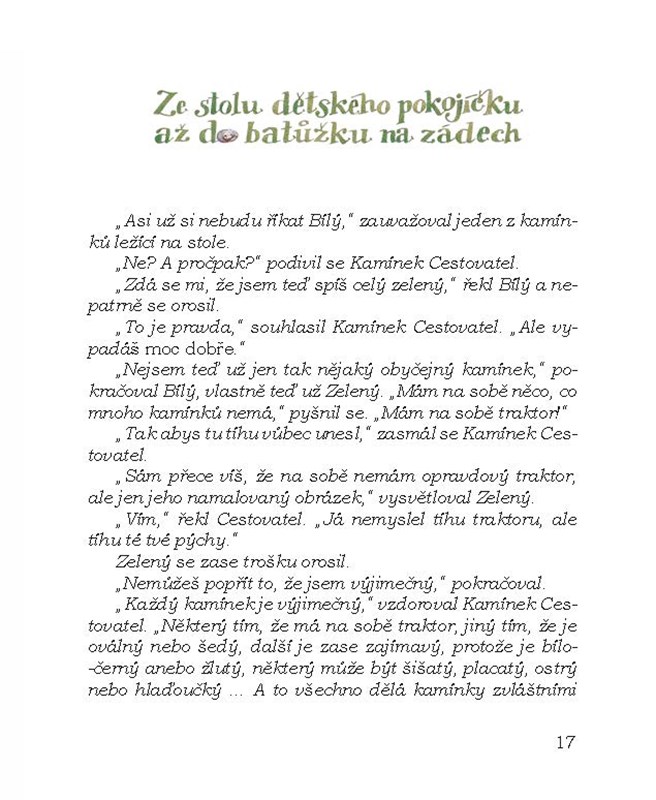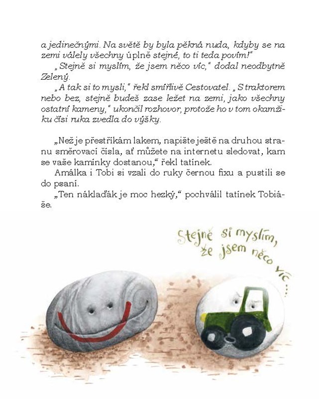 Sourozenci Amálka a Tobiáš najdou pěkný kamínek. Kamínek, který už byl leckde a zažil mnohá dobrodružství. Ale obrázek? Ten na sobě ještě neměl! To se změní, když na něj Amálka namaluje úsměv. A ponechá ho na nejzajímavějším místě, které najde – v koruně stromu. A protože cesty kamínků jsou nevyzpytatelné, ocitá se pomalovaný hrdina ve vlaku, v kufru, na Ještědu, na letišti, a dokonce až v daleké Americe. Jestlipak se s ním Amálka ještě někdy shledá?