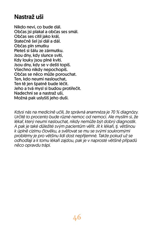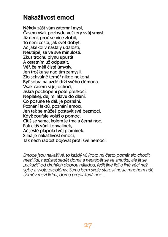 Tato sbírka básní nabízí koktejl z rulíku zlomocného i pohlazení po duši. Autorka v ní popisuje, čím si člověk projde po vážné kardiologické diagnóze a jaké je to jiné, když jste navíc sami kardiologem. Pokud je vaše nemoc genetická, můžete si klást otázku, zda jste stále plnohodnotným člověkem, když máte mutaci v té nejniternější podstatě svého já, ve své DNA. Anebo nakonec pochopíte, že váš handicap je i vaše nová výhoda, dává vám totiž možnost podívat se na svět jinak než dřív a vidět, co vám dříve zůstávalo skryto. Žijeme ve světě, ve kterém je konečnost základním zákonem. Vydejme se na cestu až na její hranici. Pokud je váš život naplněný a dává smysl, pak je jeho konečnost přijatelná.