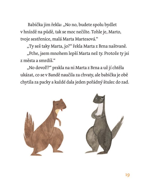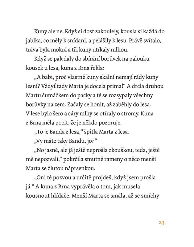 Malá Marta je kuna. A je z Brna. A je to kuna skalní. A kuny skalní nesnáší kuny lesní. A mezi ty se malá Marta dostane, když musí z Brna přesídlit k babičce na venkov. Poté, co se babička a nová Martina kamarádka ocitnou v nebezpečných spárech Chytače, jdou obvyklé spory mezi kunami stranou. Jedině spojenectví totiž může zvítězit. A taky lstivé válečnické triky, které Marta vyčetla z chytrých knih.