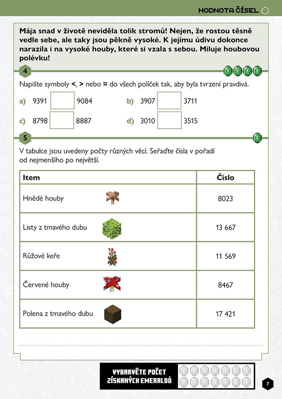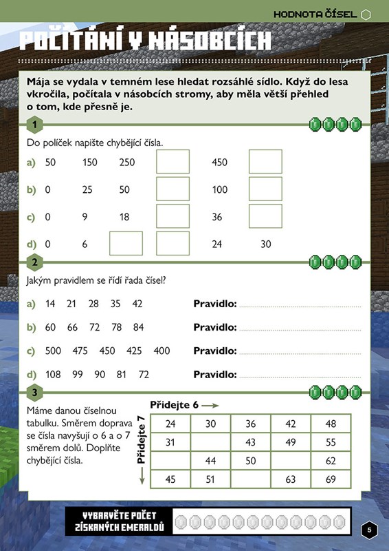Vyřešte matematické úlohy a pomozte minecrafťákům Máje a Oskarovi na jejich misích. Musíte spolu zvládnout číselné řady, klasické početní příklady, zlomky, míry i geometrii a statistiku. V každém biomu na vás čekají různé příklady, během procházení knihou získáte emeraldy a zvolíte si, jak s nimi naložíte. Odměna bude stát za to!