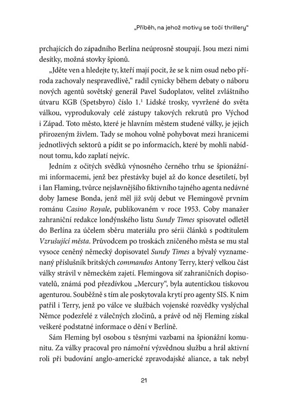 Avšak to ještě netušili, že se v britských tajných službách skrývá sovětský špion, který plány na vyhloubení tunelu vyzradil KGB ještě před jeho vybudováním... Špioni pod Berlínem vám představí nejen hlavní aktéry berlínské špionážní akce, ale i tehdejší napjaté geopolitické prostředí. Kniha čerpá z rozhovorů s očitými svědky a z celé řady odtajněných historických pramenů. Kniha mimo jiné hledá odpovědi na otázku: Proč KGB neinformovala o tunelu Rudou armádu? Stála za tím snad rivalita mezi tajnými službami? Nebo byl britský špion tak cenný, že KGB raději obětovala tajemství Rudé armády, než aby ho ohrozila?