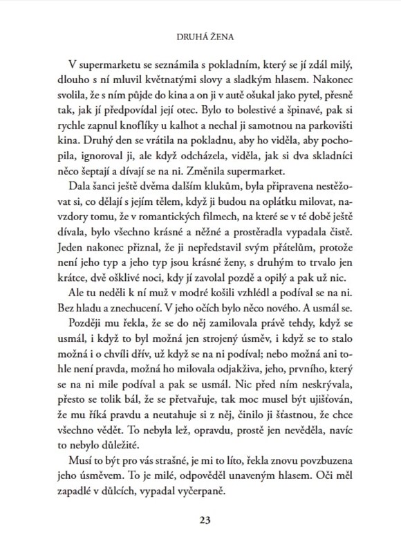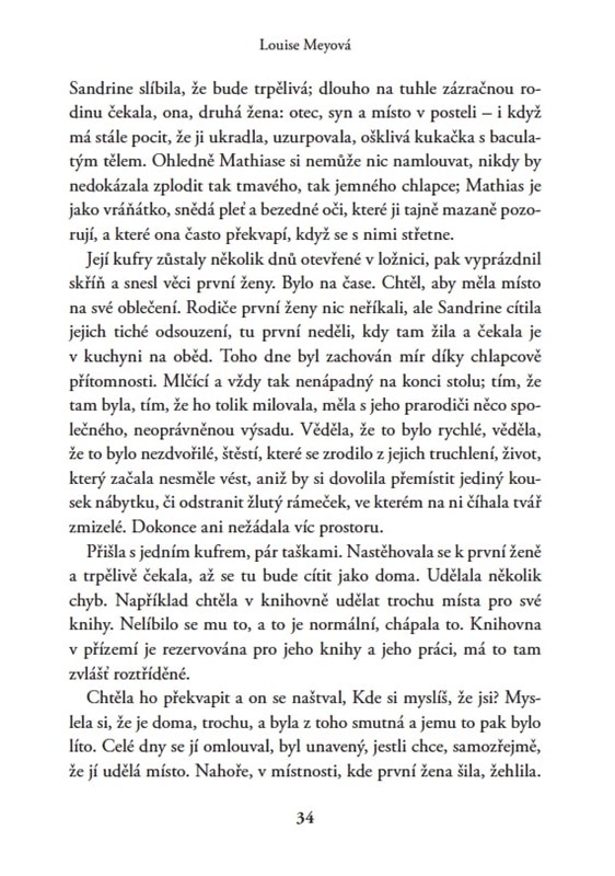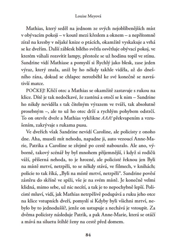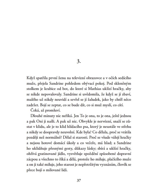 Plachá a nepříliš výrazná Sandrine už vzdala všechny naděje na lásku. A pak ho uviděla. V televizi. Plakal, jeho žena záhadně zmizela a on prosil veřejnost o pomoc. A tak se potkali. A potom i zamilovali. Začali spolu žít a vychovávat mužova syna z předchozího vztahu. Jednoho dne se však první žena znovu objeví a Sandrinin pečlivě vystavěný snový svět se zhroutí jako domeček z karet. Co se vlastně tehdy odehrálo? Kdo nese vinu a kdo je oběť? A můžeme mluvit o oběti, když nedošlo k žádnému zločinu? A jsme si tím vším jisti?! Formálně i dějově experimentální román moderní francouzské autorky Louise Mey se vás zeptá na mnohem víc...