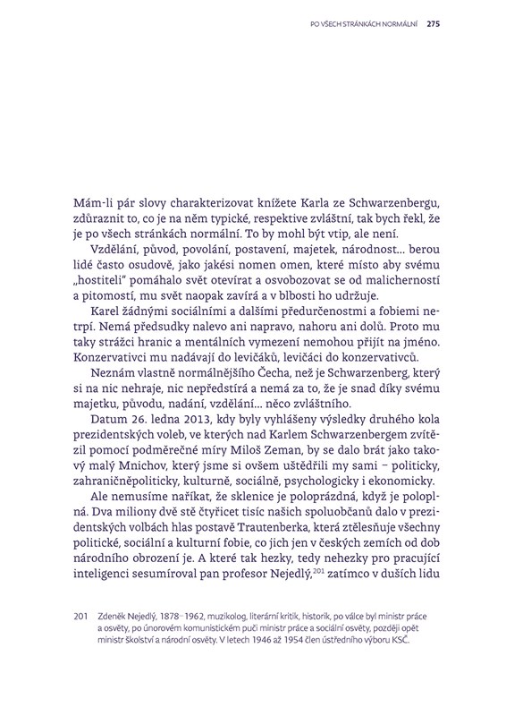 Za protektorátu je vystěhovali z jejich pražského paláce, dva roky po válce, ještě před únorem 1948, jim parlament zvláštním zákonem vyvlastnil majetek, před komunisty museli utéct, aby je nezavřeli, desítky let se do své vlasti nesměli vrátit... Přesto na ni Karel VII., kníže ze Schwarzenbergu, vévoda krumlovský, hrabě ze Sulzu a lankrabě klettgavský nezanevřel. Sloužil jí v emigraci a pak i po svém návratu na sklonku roku 1989. Se stejnou noblesou, pokorou i vtipem, s nimiž vypráví novinářce Renatě Kalenské svůj životní příběh. V něm se odráží nejen složitost vztahů mezi českou společností a šlechtou od zrodu první československé republiky, ale z určitého úhlu pohledu i historický vývoj této země v uplynulých osmdesáti letech. Svědectví o době a člověku, který zná svět a umí v něm důstojně žít.