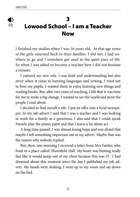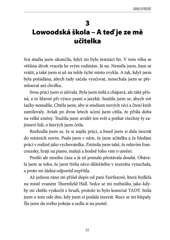 Nejznámější dílo Charlotty Brontëové, román o statečné mladé ženě, které bylo tolik nepřáno osudem a která se přesto dočkala svého štěstí, patří mezi vrcholy anglické literatury. Autorka dokázala perfektně vykreslit proměnu křehké mladé dívky v sebevědomou ženu, jež nedbá společenských pravidel a jde si za tím, po čem její srdce touží.