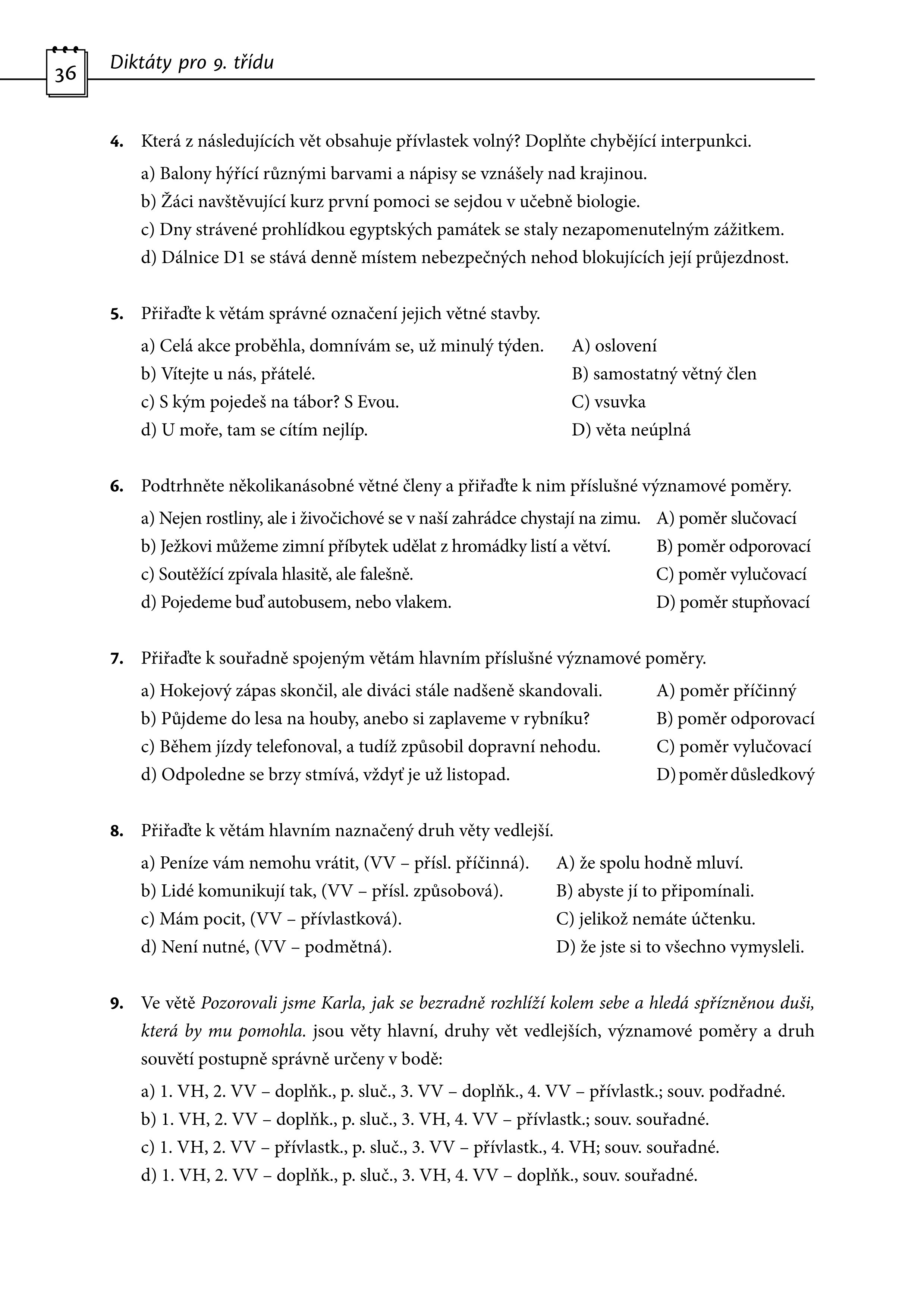 Všechny diktáty i testy jsou zaměřeny na zopakování veškerého učiva probíraného nejen v 9. ročníku, ale vlastně během celé školní docházky. Procvičíte si slovní zásobu a význam slova, tvoření slov, tvarosloví i skladbu. Zdokonalíte si pravopis od vyjmenovaných slov, přes psaní i/y v koncovkách, skupin mě, mně, až po velká písmena. Přes vytvoření představy o stavbě věty se dopracujete až k objasnění pravidel psaní čárky ve větě.