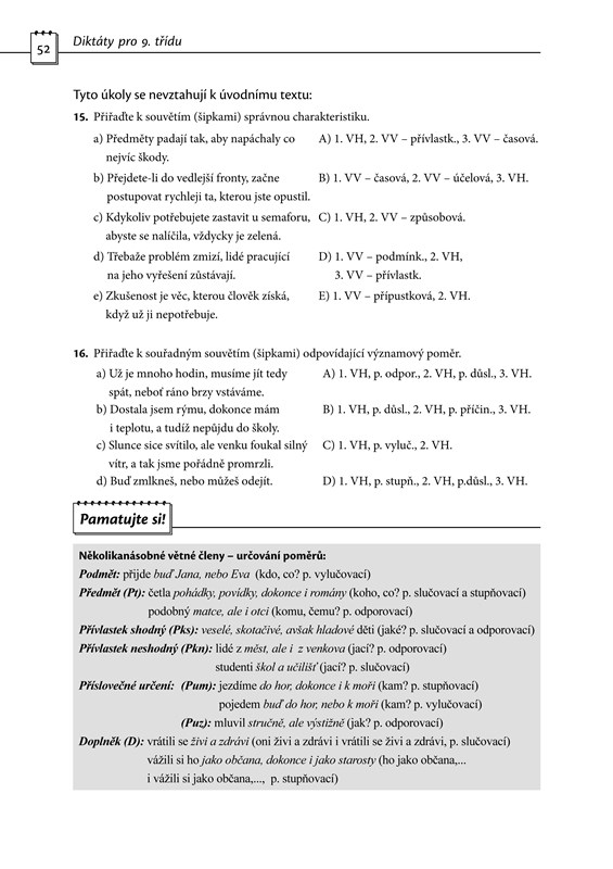 2) 15 jazykových testů: prvních osm vychází z probraného učiva a je rozděleno podle jednotlivých tematických okruhů, např. tvarosloví, tvoření slov, skladba apod. Zbývajících sedm testů je věnováno souhrnnému opakování veškerého probraného učiva. I v této části najdete doplňovací diktáty a praktické „taháky“ s obtížnými pravopisnými jevy.