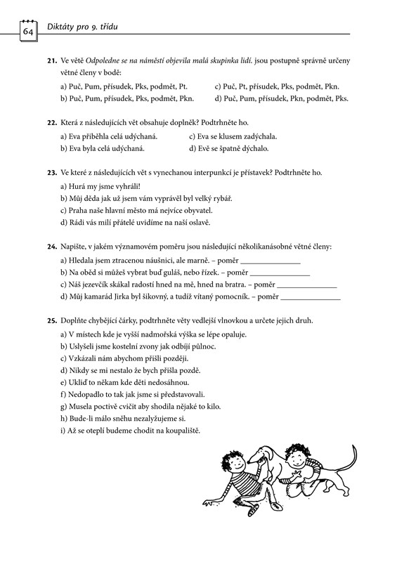 1) 15 doplňovacích diktátů: obsahují veškeré pravopisné jevy, které jsou obsaženy v krátkých příbězích. Diktát vám může také někdo nadiktovat podle klíče v závěru publikace.