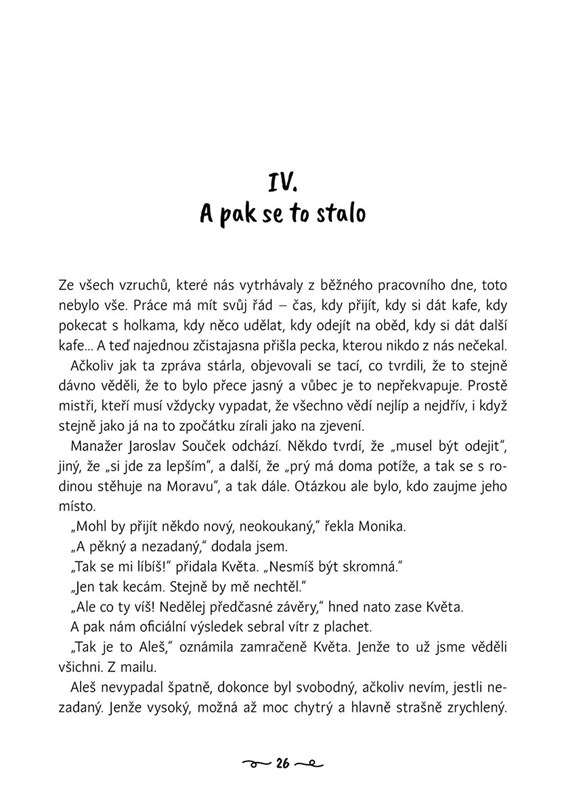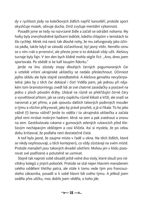 ...Nudit se tudíž nebudete, není na to čas ani prostor, před vámi se odvíjí svižně odsýpající děj vyprávěný hlavní hrdinkou. Autorka nabízí zábavné čtení, v němž je humoru a vtipu tak akorát. Není křečovitý, naopak, baví od počátku až do konce. ...