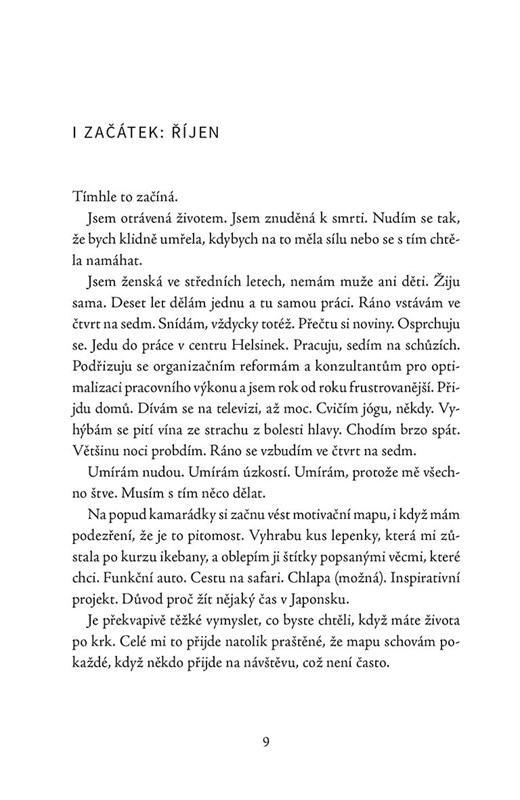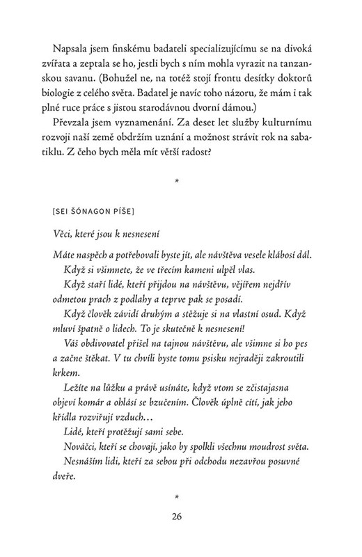 Když se Mia ve svých osmatřiceti letech ocitne na prahu vyhoření, dá výpověď v práci a odjede do Japonska. Doufá, že se jí zde podaří najít životní motivaci u dvorní dámy Sei Šónagon, básnířky, která žila před tisícem let. V Kjótu nikoho nezná a nemluví japonsky, ale četla Seiny Zápisky pod polštář a má pocit, že našla spřízněnou duši – moderní ženu, jejíž postřehy o životě jako by vypadly z pera Virginie Woolfové. Při pátrání po osudu Sei Šónagon Mia objevuje místní chrámy, zahrady, čajovny a bary a nechává se okouzlit kvetoucími sakurami, zenovými meditacemi nebo divadlem kabuki. Z jejích zážitků vzniká jedinečný příběh – osobní cesta, na jejímž konci možná najde sebe samu.