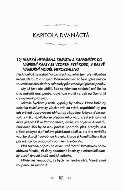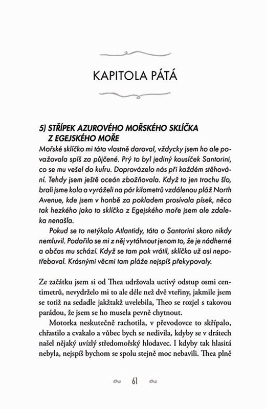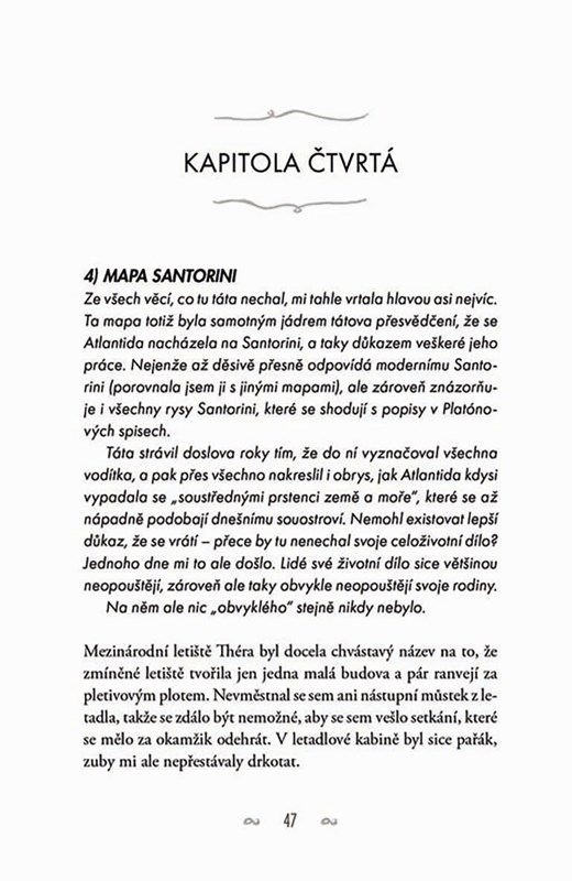 Liv Varanakisová o svém otci moc nepřemýšlí – utekl od nich do Řecka, když byla malá, a zbyla jí po něm jenom bolestná změť vzpomínek na jejich společnou vášeň pro dávno ztracenou Atlantidu. Takže když jí od něj po letech najednou přijde pohlednice, na níž ji zve, aby mu přijela pomoct s natáčením dokumentu právě o Atlantidě, zrovna nadšená není. Setkání s otcem po mnoha letech není žádný med. Nechce se nechat vcucnout zpátky do jeho světa. A určitě nepotřebuje, aby svědkem rozporuplných pocitů byl okouzlující Theo, který jejímu tátovi pomáhá s natáčením. Santorini je nádherný ostrov – dechberoucí západy slunce, tyrkysové moře, sluncem rozpálené vesničky, lahodné jídlo, učiněný ráj na zemi. Liv však pomalu zjišťuje, že tam všechno tak úplně dokonalé není – zdá se, že táta ji tam pozval ani ne tak kvůli Atlantidě, ale něčemu mnohem důležitějšímu.