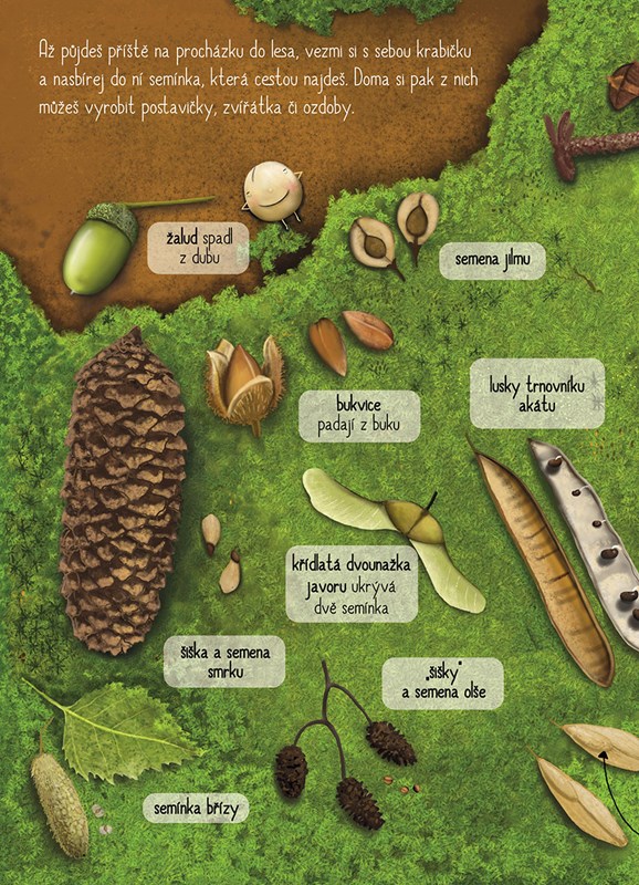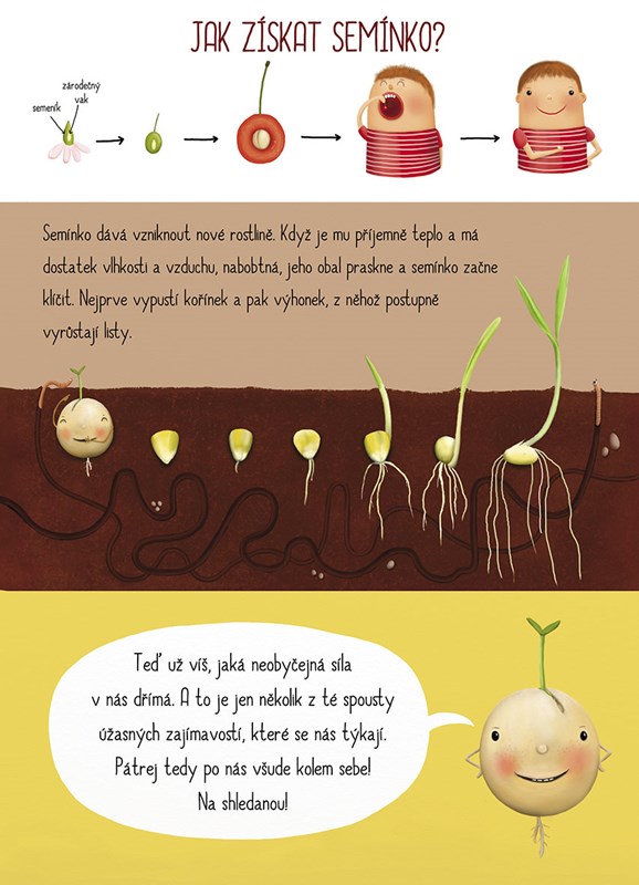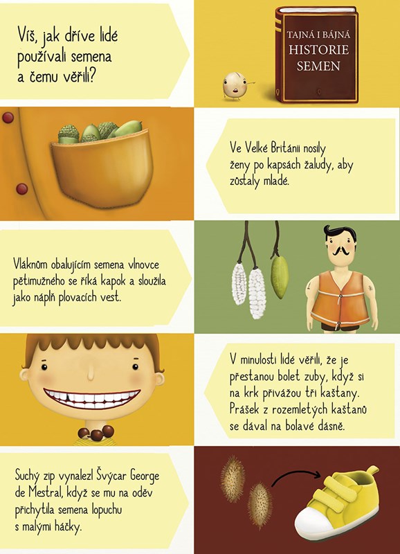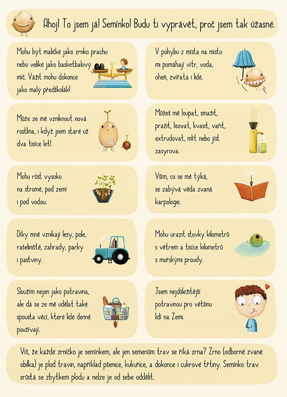 V této knize plné krásných ilustrací se dozvíte zajímavosti o semenech ze všech koutů světa. Zjistíte, jaké pochoutky se vyrábějí z ořechů a dalších semínek, jak vypadají semena květin, stromů nebo jak semínka klíčí.