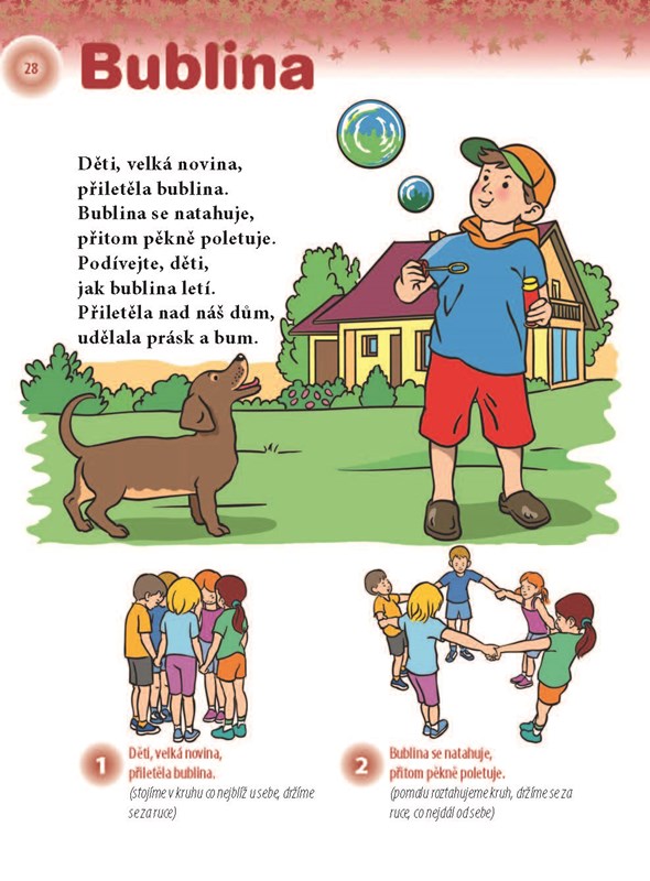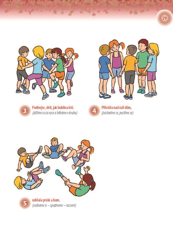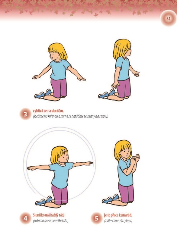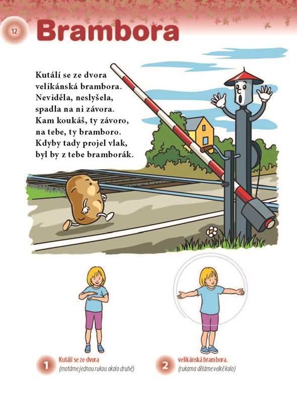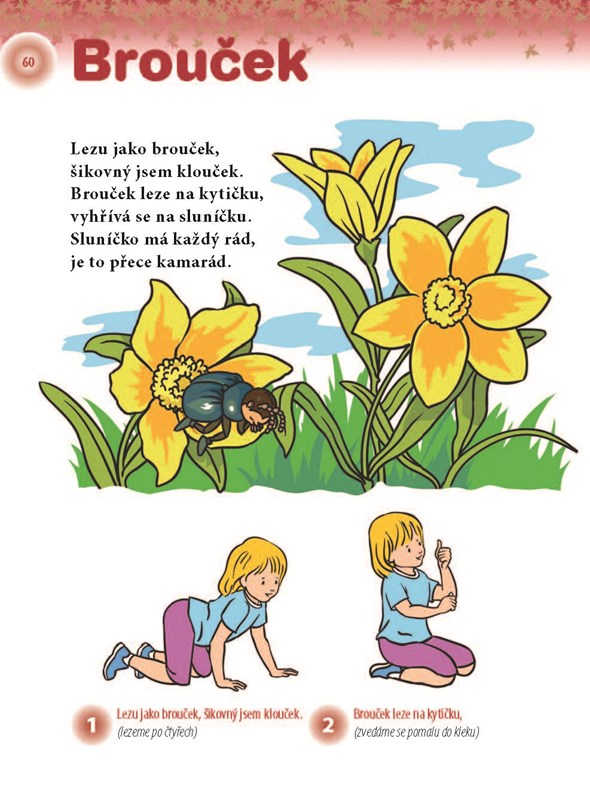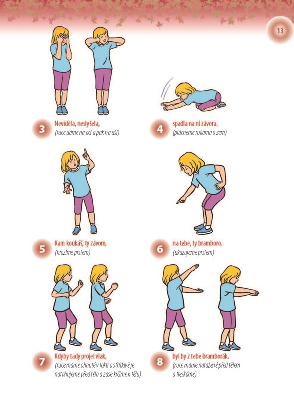 Oblíbené říkanky, milé barevné obrázky a spousta pohybu představují kombinaci, kterou mají děti rády a kterou ocení i rodiče. Je to další možnost, jak procvičit řečové i pohybové dovednosti, protrénovat paměť a v neposlední řadě také zažít legraci, upevnit vazbu s dítětem, dodat mu sebevědomí, vše tak potřebné k psychické pohodě a rozvoji jeho osobnosti. Najdete zde rady, jak procvičit jemnou motoriku, či nápady na cvičení proti plochým nohám. Knihu mohou využít rodiny s jedním či více dětmi i dětské kolektivy.
