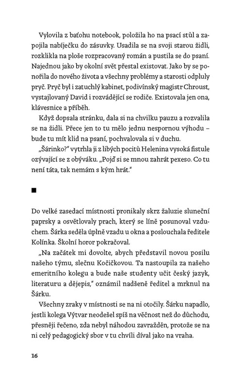 Šárka věří, že když udělá patou v zemi důlek, někde vyroste hora. Sní o tom, že se jednou bude živit psaním knih. Co na tom, že momentálně není jiná možnost než učit češtinu na maloměstské průmyslovce, vždyť každá hora se zvedá z údolí. V nížinách jejího života to ale právě chaoticky bzučí jako v úlu – matka randí s mladším kolegou, otec prchá k bigbítu a k pivu, bratr má silnou slabost pro marihuanu, babička trpí alzheimerem, cynický kolega srší nesnesitelným sarkasmem a Šárčin přítel David je čím dál tím víc mimo… vztah. A právě když si Šárka myslí, že hlouběji už v životě klesnout nemůže, potkává Ivana, charismatického spisovatele, který by byl dokonalý, kdyby nebyl čerstvě v důchodu. Šárka se zamiluje, a tak začne podivná hra na schovávanou. Kdo vyhraje? Kdo se nechá zapikat? A kdo ze hry odstoupí?