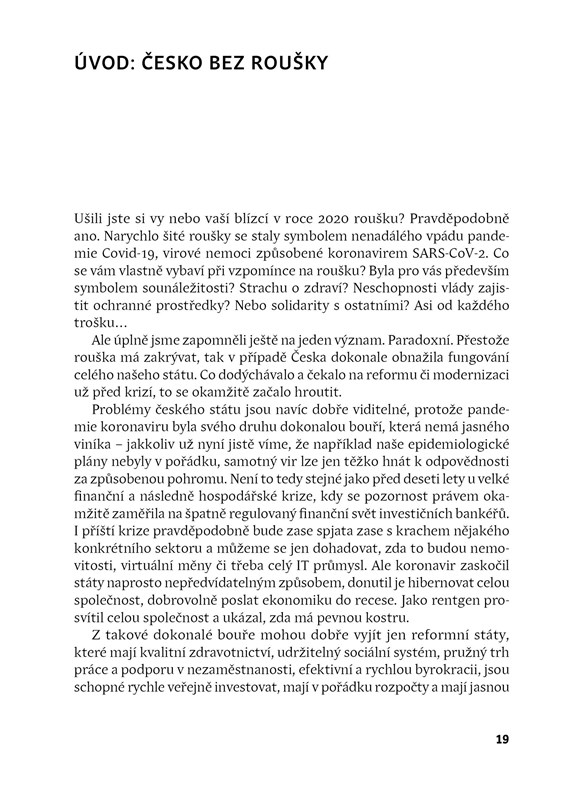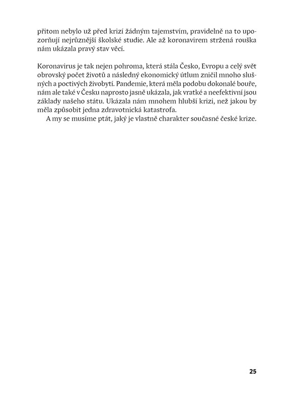 Novinář David Klimeš přináší ve velmi aktuální knize přehled některých z těch nejakutnějších problémů, jimž dnes čelí Česká republika. Situaci přirovnává k předčasné krizi středního věku, která se projevuje nespokojeností, nejistotou a neřešením příčin problémů. Výsledkem je „zaseklý stát“ bez silných sdílených hodnot, který nedokáže řešit některé nejnaléhavější úkoly. K nim patří například exekuce a dluhová past, do které padá stále větší procento obyvatel Česka, nebo důchodová reforma, kterou se stále nepodařilo prosadit. Tyto a další palčivé problémy autor rozebírá na základě aktuálních dat, ale nechybí ani srovnání s masarykovským postojem k „naší nynější krizi“. Text doplňují diskusní příspěvky dalších renomovaných autorů jako jsou Danuše Nerudová, Daniel Münich, Daniel Prokop či Tomáš Němeček.