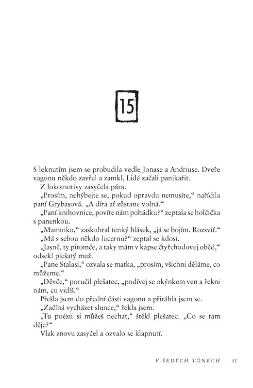 Píše se rok 1941. Lině je patnáct let a těší se, že po prázdninách půjde na uměleckou školu. Ale jednoho večera k nim domů vrazí sovětská tajná policie a společně s její matkou a malým bráškou ji odvlečou pryč. Čeká je deportace do pracovních táborů na Sibiři.