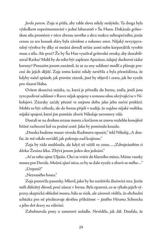 V jeho nitru však den ode dne sílí démon, který může zničit vše, co už mladý panovník vybudoval. Nikolaj se chce temné magie zbavit, proto se s věrnou pomocnicí, větrostrůjkyní Zojou, vydává na velmi riskantní cestu. Podaří se jim vyřešit záhadu královy tajemné choroby? Najdou lék, který ho zachrání, a s ním i celou Ravku?