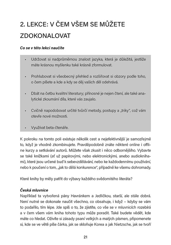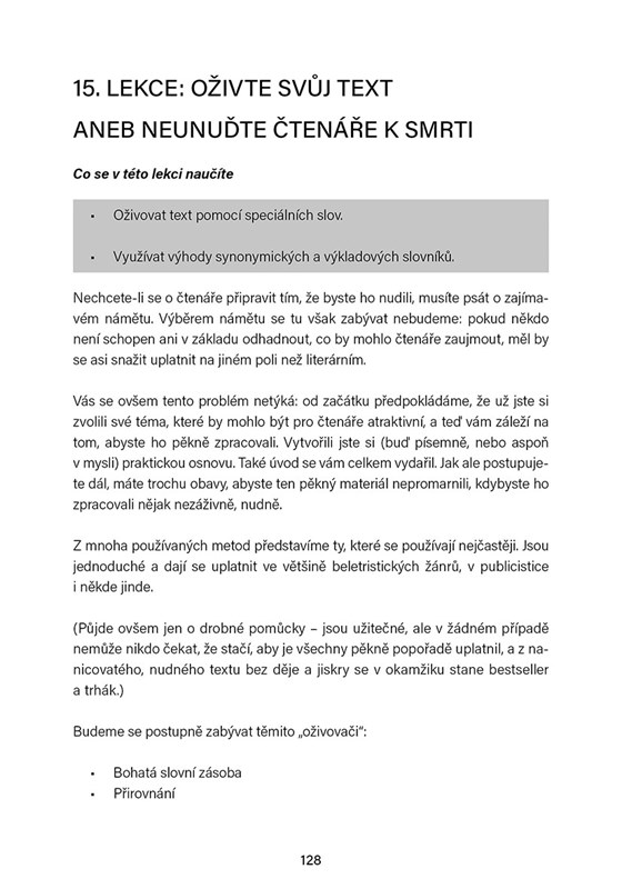 Tato příručka má čtenáři pomoci, aby se příjemnou formou zdokonalil v technice psaní: aby byl „doma“ v budování příběhu, uměl pracovat s jednotlivými postavami, aby lehce vytvářel živé, napínavé a věrohodné dialogy a ovládl spoustu dalších dovedností. Všechno je tu zaměřeno na praxi, na výsledek. Jednotlivé kapitoly přinášejí mnoho praktických informací a každá je doplněna o názorné ukázky, úkoly a cvičení.