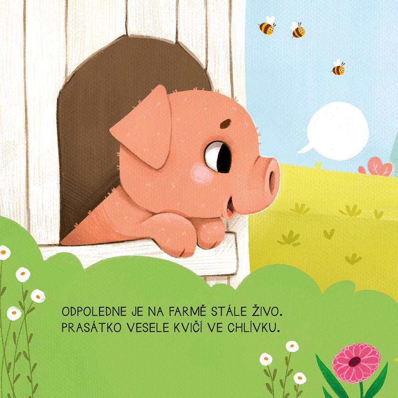 Co se děje na farmě poté, co kohoutek svým kokrháním probudí všechna zvířátka? Krávy netrpělivě bučí, ovečky bečí, prasátka kvičí… Na farmě je opravdu rušno! Přesvědči se o tom i ty, stačí jen zmáčknout kouzelné tlačítko a hlasy zvířátek se rozezní.