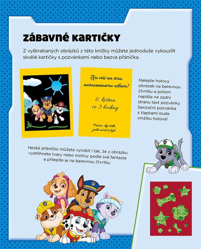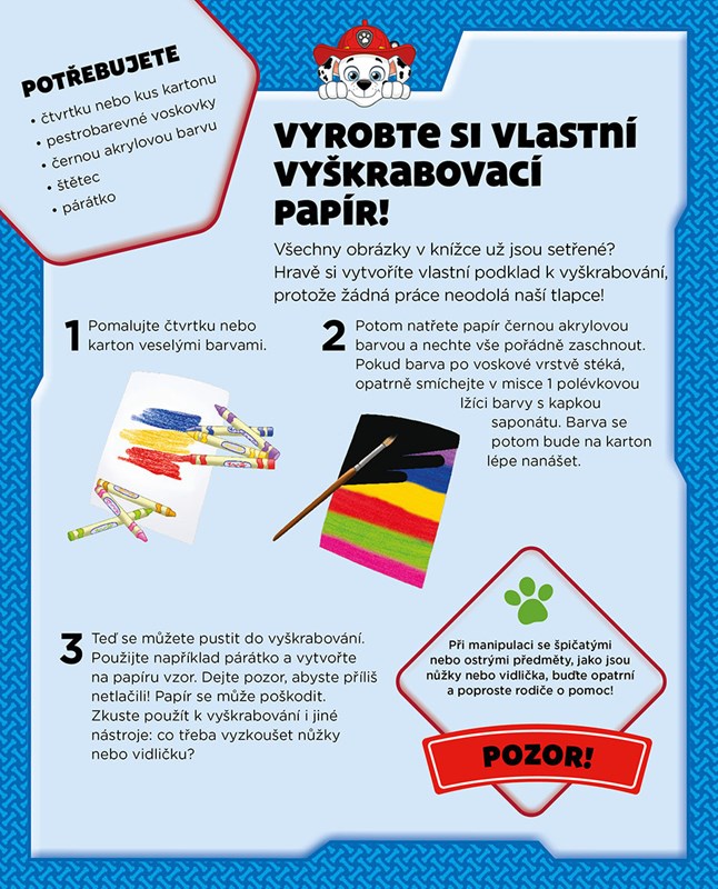 Skye, Marshall, Chase a ostatní odvážná štěňata už čekají, až je objevíte a vyrazíte s nimi za dobrodružstvím! Setřete černou vrstvu s pomocí přiloženého škrábátka a odhalte úžasné obrázky s oblíbenými hrdiny z Adventure Bay! Nechte se vést naznačenými obrysovými linkami nebo stírejte podle své fantazie a vytvořte na barevném pozadí vlastní vzory. Na zadní straně všech obrázků navíc najdete skvělé omalovánky s Tlapkovou patrolou a čekají vás i kreativní nápady na vlastní tvoření.