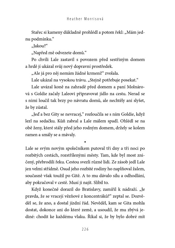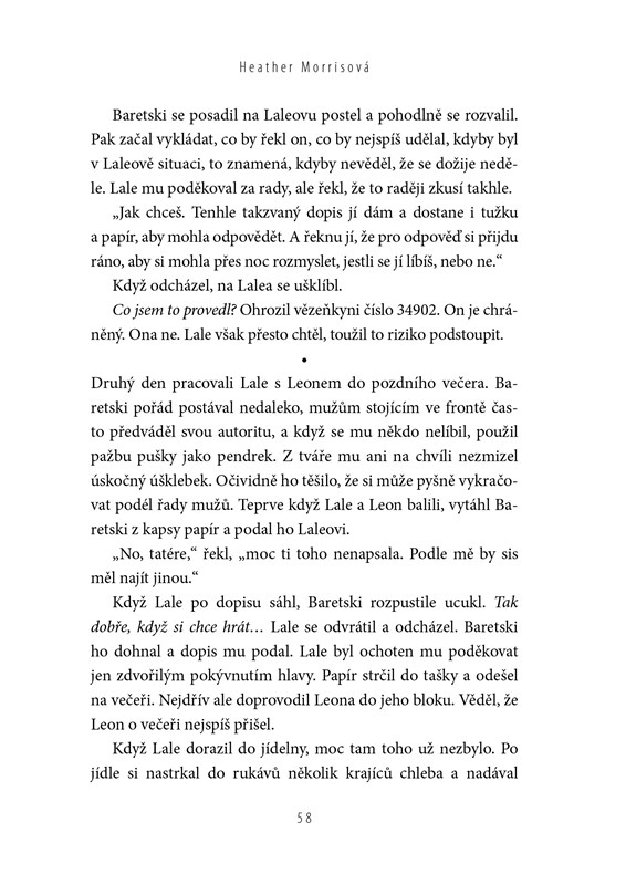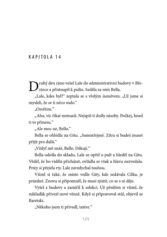 O holocaustu existuje bezpočet knih. Tato je však unikátní. Lale Sokolov velmi dobře věděl, co spoluvězně i jeho samotného čeká, a byl odhodlán nejen přežít, ale také žít naplno. To, co poznal, je sice strašlivé, ale současně plné naděje a odvahy. A v jeho vzpomínkách má své místo kupodivu také láska. V řadě vězňů čekajících na tetování stála i zděšená, chvějící se dívka. Pro Lalea – trochu drzého hazardéra – to byla láska na první pohled. Jeho a Gitin příběh, ověřený podle všech dostupných dokumentů a déle než sedmdesát let nevyprávěný, potvrdil jejich syn. Jen sotva mohli tehdy doufat, že se ho dočkají. Při čtení budete možná slzet, děj knihy vás však také povzbudí.