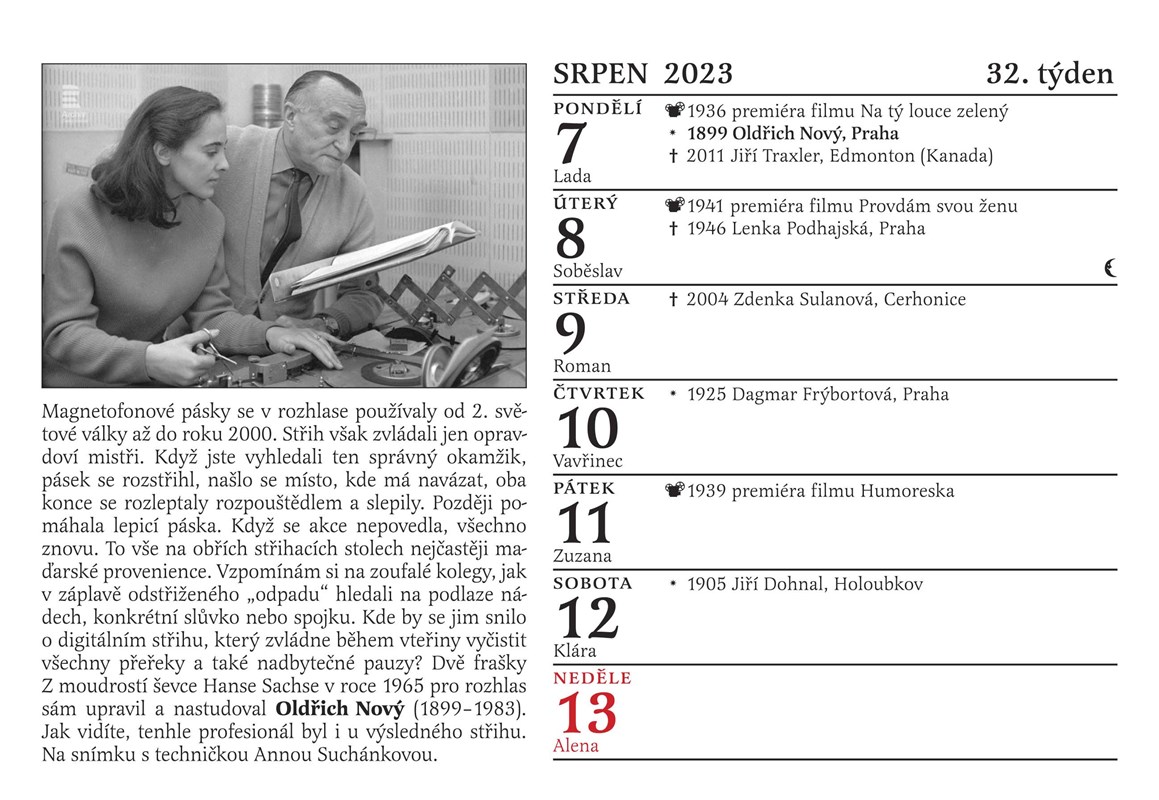 A ještě jedno překvapení: poslouchejte každou neděli mezi 14. a 16. hodinou na Českém rozhlase Dvojka Nedělní Kolotoč Michala Jagelky. Jeho součástí totiž bude po celý rok 2023 společné otáčení kalendáře. Nový týden jako by v éteru ožil, a to, co si na stránce kalendáře přečtete a prohlédnete, si ve vysílání rovnou i poslechnete! Jsme tedy prvním kalendářem v historii, kterým je možné nejen listovat, ale který si můžete i poslechnout. Jak by ne, vždyť rozhlas slaví narozeniny!