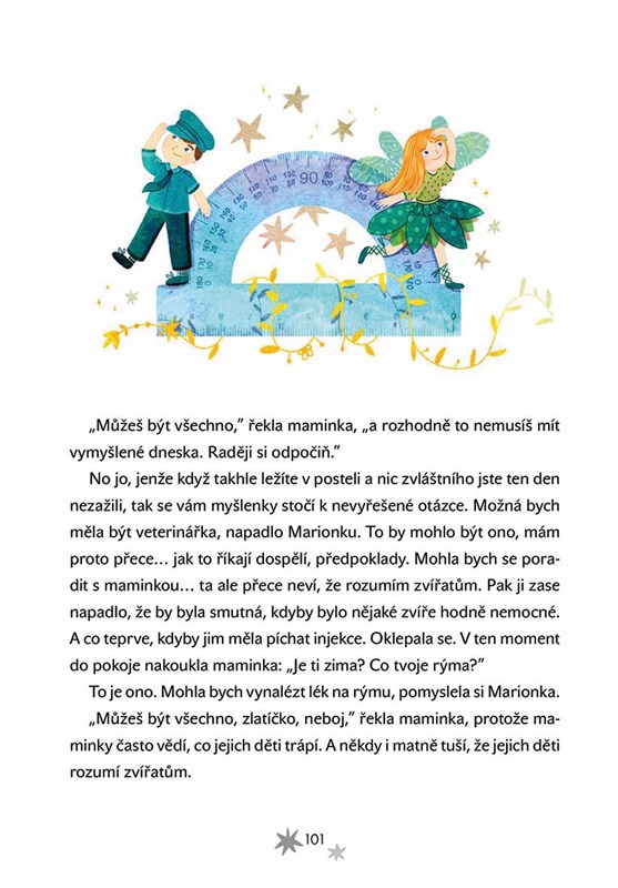 Mariončino nadšené snění nakonec strhne i rozvážného Matyáše a věřte, že otevře oči i vám. Seznámíte se s deštníkovou vílou a procestujete daleké kraje. Zjistíte, jakým kouzlem vládnou cizí jazyky a jak odhalit tajemství, které může být skryto na stránkách knih.
