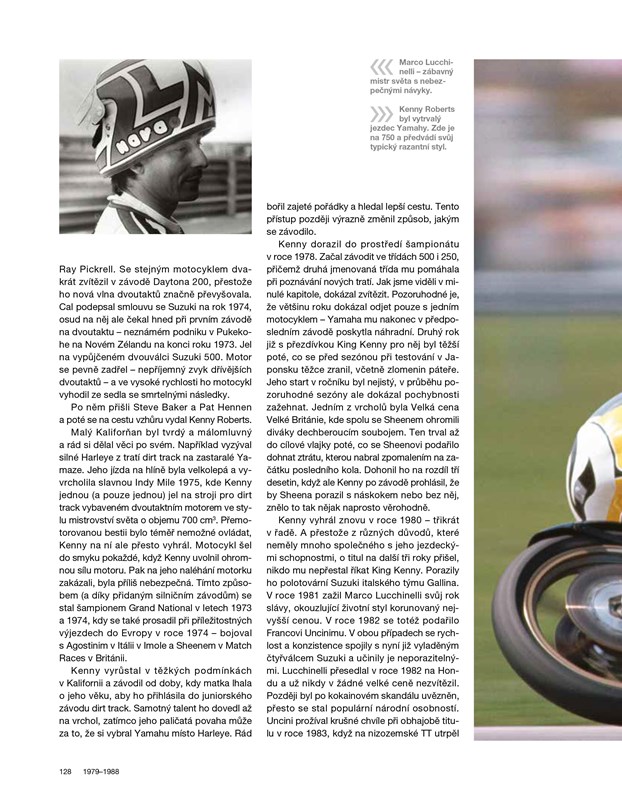 Od počátků Mistrovství světa silničních motocyklů v éře Geoffreyho Ernesta Duka a Johna Surteese, přes dobu Barryho Sheena a Giacoma Agostini, až k současným hrdinům jako je Valentino Rossi.