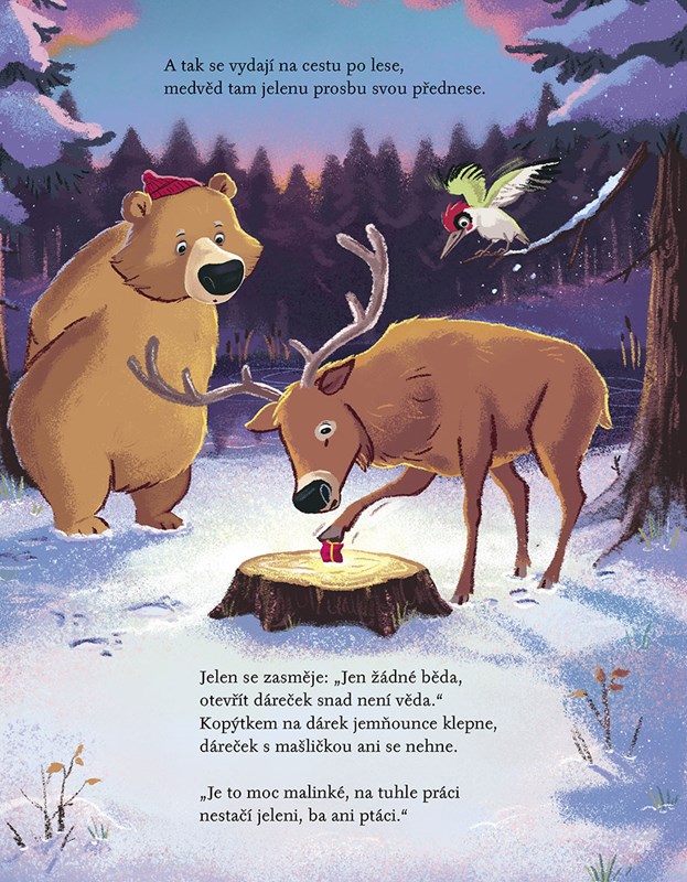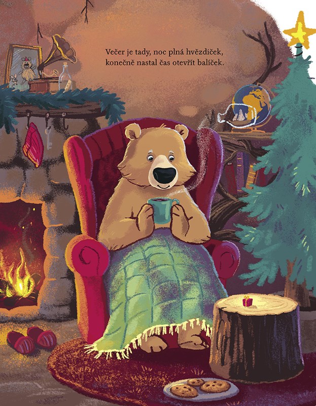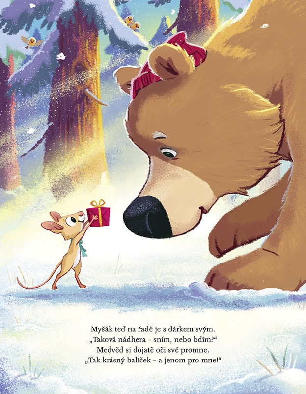 Myšák a medvěd milují Vánoce. Všechno se třpytí a těch dobrot a vůní! Letos se medvěd rozhodl vynechat zimní spánek a zůstat na Štědrý den vzhůru. Vymění si s myšákem dárky a medvěd se těší, až si ten svůj večer doma otevře. Ale ouha, jeho velké tlapy si s krásně zabaleným dárkem od myšáka neumí poradit. Nebude se na něj kamarád zlobit? Jak tohle jenom dopadne?