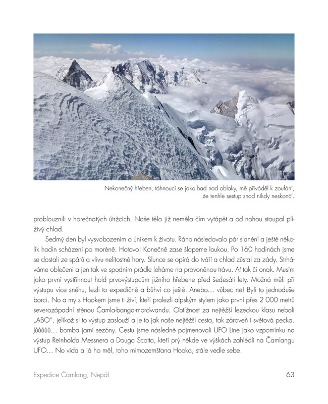 Každým nádechem v řídkém ledovém vzduchu jsem byl blíž k naplnění snu. Též smrti, která čekala jen na drobné zaváhání. Vnímal jsem vlastní křehkost, naprosté vyčerpání a zároveň silnou radost z bytí. Rok 2019 mým horským výpravám doopravdy přál. Nové výstupy mi přinesly uznání i ocenění za nejlepší horolezecký počin na světě. Lezení však není o stupních vítězů, ale o zážitku, kdy se dotýkáte překrásných štítů pod oblohou plnou hvězd.