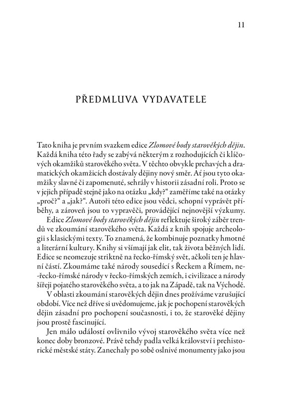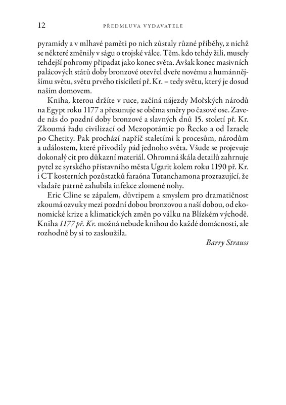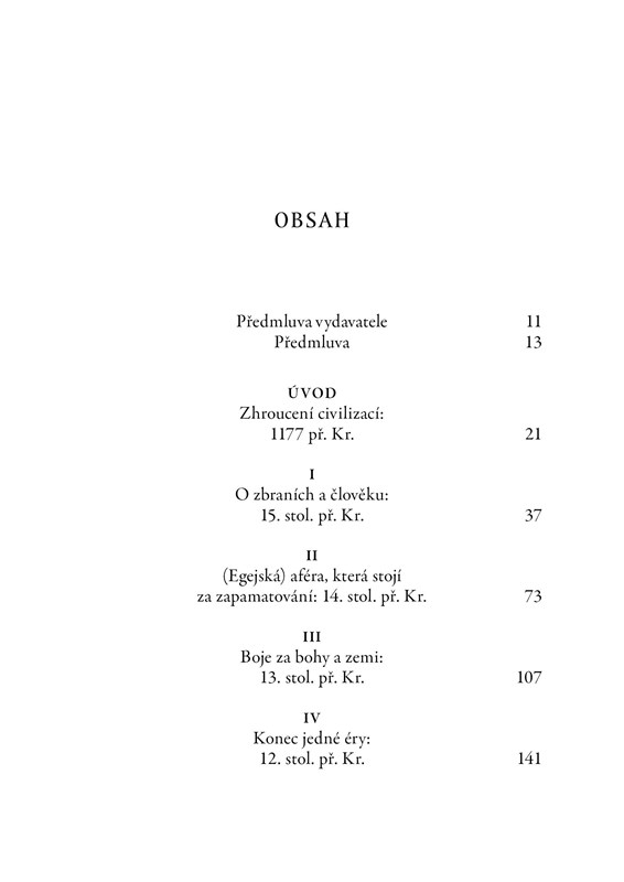 Kniha amerického archeologa a historika je pátráním po tom, co způsobilo oslabení a v některých případech i zánik vyspělých civilizací a měst ve východním Středomoří, jakými byly Egypt, Chetitská říše nebo třeba kosmopolitní obchodní přístav Ugarit na konci 13. století př. Kr. – v období, které můžeme s jistou rezervou označit jako „první mezinárodní věk“ v dějinách lidstva. Hledá odpovědi na otázku, jak vlastně v těchto oblastech došlo k nástupu „doby železné“ a jaký to mělo význam pro formování kořenů dnešní „západní“ kultury. Tyto změny jsou tradičně spojovány s příchodem tzv. mořských národů. S paralelami k dnešní situaci nejen ve Středomoří se spolu s autorem můžeme ptát, zda tyto změny lze z větší části přičíst jednomu faktoru, události a datu, nebo spíše sérii katastrof a dominovému efektu, posílenému vzájemným propojením tehdejších politických útvarů.