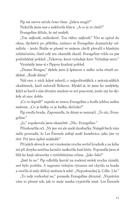 Célie nebude patřit k mým nejoblíbenějším hlavním hrdinkám. Přesto jsem s ní v určitých chvílích měla pochopení a bylo mi líto, čím vším si musela projít. Zvlášť když ji ostatní, včetně jejího snoubence, považovali za slabou a měli nutkání ji v jednom kuse chránit. Jasně bylo to z lásky, ale člověk se stává silnějším až když se svými démony začne bojovat sám. Líbilo se mi, jak si potom nebála přiznat, že směr, kterým se vydala není správný. Miluje své přátele nad všechno na světě a pro jejich ochranu by udělala cokoliv, i kdyby to mělo znamenat, že se bude muset spolčit s tisíce let starým upírem..