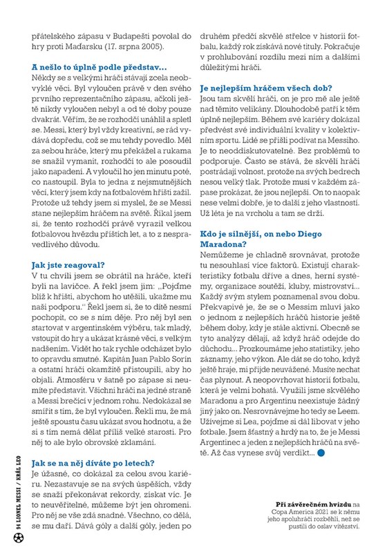 Toto bohatě ilustrované album se ohlíží za Messiho prvními kroky v Rosariu, jeho největšími úspěchy s Barçou, prvním velkým titulem s Argentinou v roce 2021, kdy mu bylo 34 let, na Copa America a zákulisím jeho příchodu do Paříže.