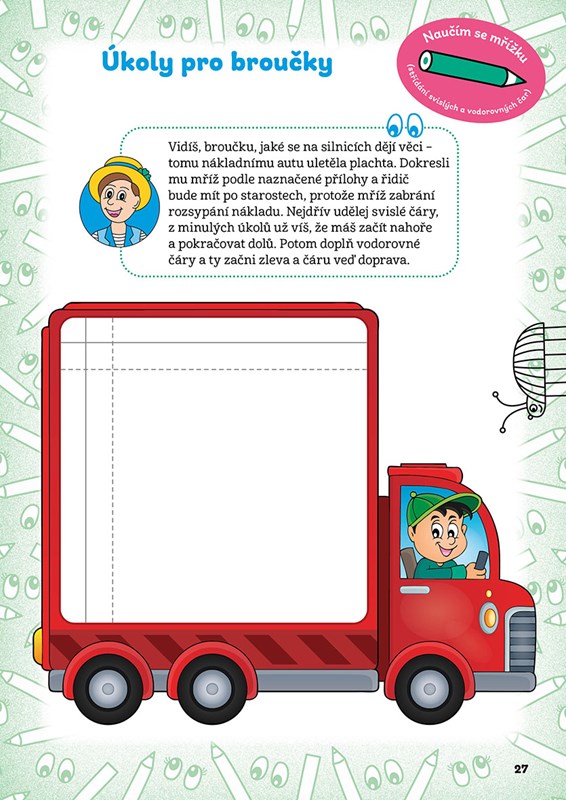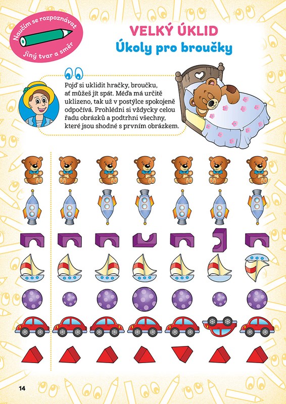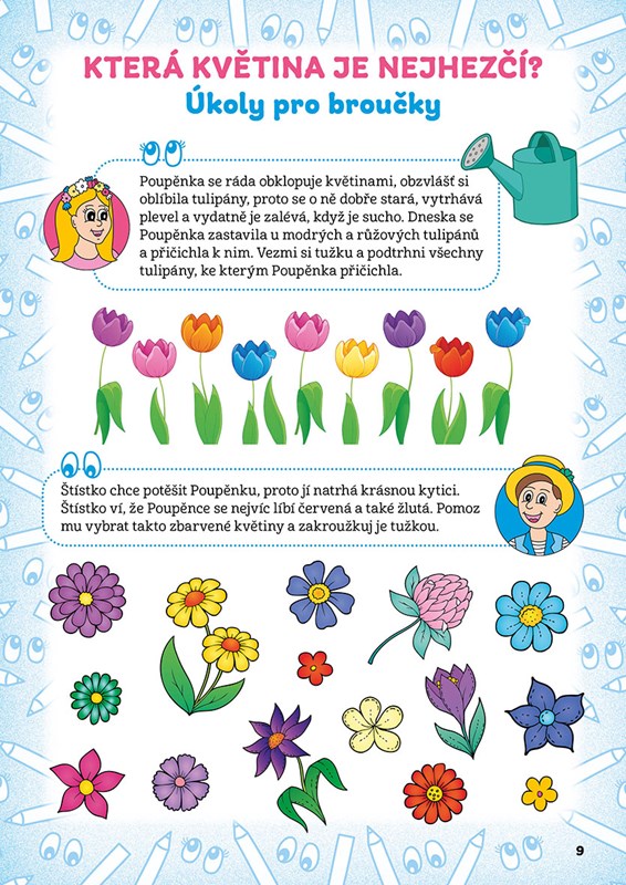 Zavedou vás na nejrůznější místa, třeba k moři, nebo s nimi nakouknete do kuchyně, kde se připravují laskominy, zjistíte, co roste na zahrádce a kdo tam žije, a společně si odskočíte za zvířátky na lesní palouk. Ale to si pište, broučkové, vaše tužka a pastelky nebudou nikde zahálet, naopak pořádně se vyřádí. Na závěr velkého reje pastelek a tužek se vypravíte do cirkusu, kde se to hemží rozesmátými klauny s pusou od ucha k uchu, všetečnými opičkami, důstojnými slony i rozvernými slůňaty… Zkrátka vás všichni účinkující okouzlí svými skvělými vystoupeními. A když se vloudí malá chybička? Nevadí, vy jim, milí broučkové, s pomocí tužky a pastelek a také s pomocí našich úkolů určitě rádi pomůžete.