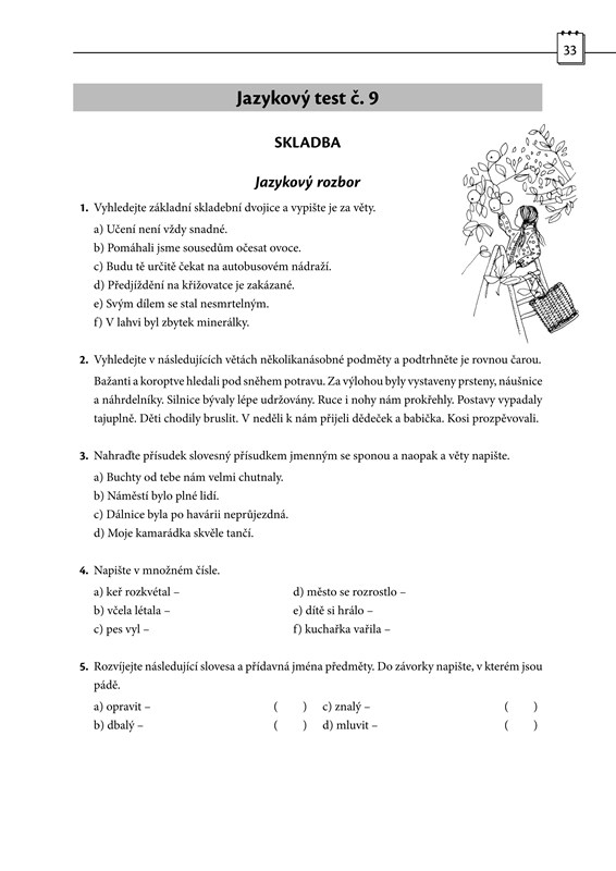 2) 15 jazykových testů: prvních devět je řazeno podle tematických celků probíraných v ročníku, zbývajících šest slouží k souhrnnému opakování základního učiva. Některé z testů obsahují ještě i pravopisnou část a navíc praktické „taháky“ zahrnující pravopisné jevy, v nichž se často chybuje.