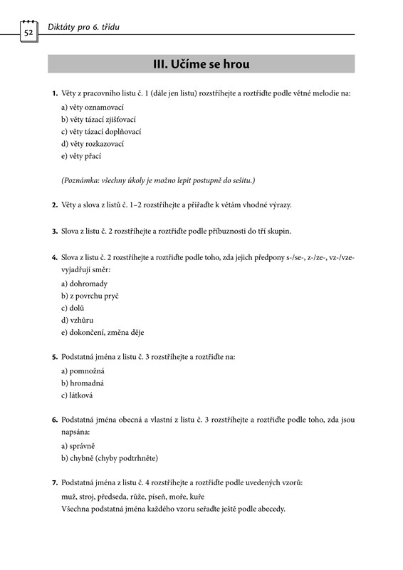 3) 12 úkolů v části Učíme se hrou: k této části náleží 11 volných pracovních listů, které žáci postupně rozstříhají a třídí podle úkolů v zadání. Úkoly si mohou postupně nalepovat do sešitu.