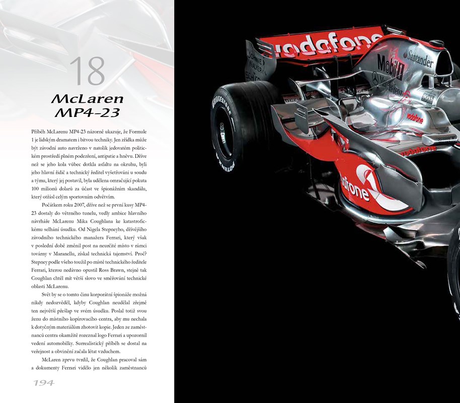 Formule 1: Umění rychlosti bude lahodit oku jak fanouškům motosportu, tak nadšencům pro kvalitní fotografii. Kniha představuje profily dvaceti dvou špičkových závodních vozů, jež se v průběhu více než sedmdesáti let Formule 1 nesmazatelně zapsaly do historie Velkých cen. Od monopostu Alfa Romeo 158, který vynesl v roce 1950 první titul F1 Giuseppe Farinovi, až k Lotusu E21 – prohlédněte si křivky závodních vozů každé éry na dechberoucích fotografiích od profesionálního motoristického fotografa Jamese Manna a seznamte se s neuvěřitelnými příběhy jejich vzniku v profilech od zkušeného novináře Stuarta Codlinga a v zasvěcených komentářích legendárního automobilového návrháře a konstruktéra Gordona Murrayho.