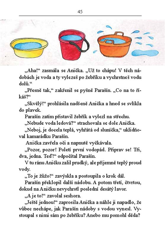 Letní prázdniny utíkají jako voda, Anička jejich začátek strávila na řece. Byl to báječně dobrodružný i trochu nebezpečný týden, vždyť sjela na kánoi Lužnici! Teď se Anička chystá k babičce na vesnici. Chodila tam jeden rok do školy, kamarádky ji už očekávají. Anička se na ně moc těší, i na Parašína, s kterým byla vždycky zábava – a zase ji překvapí. Jaký tedy bude konec prázdnin, co všechno Aničku čeká?