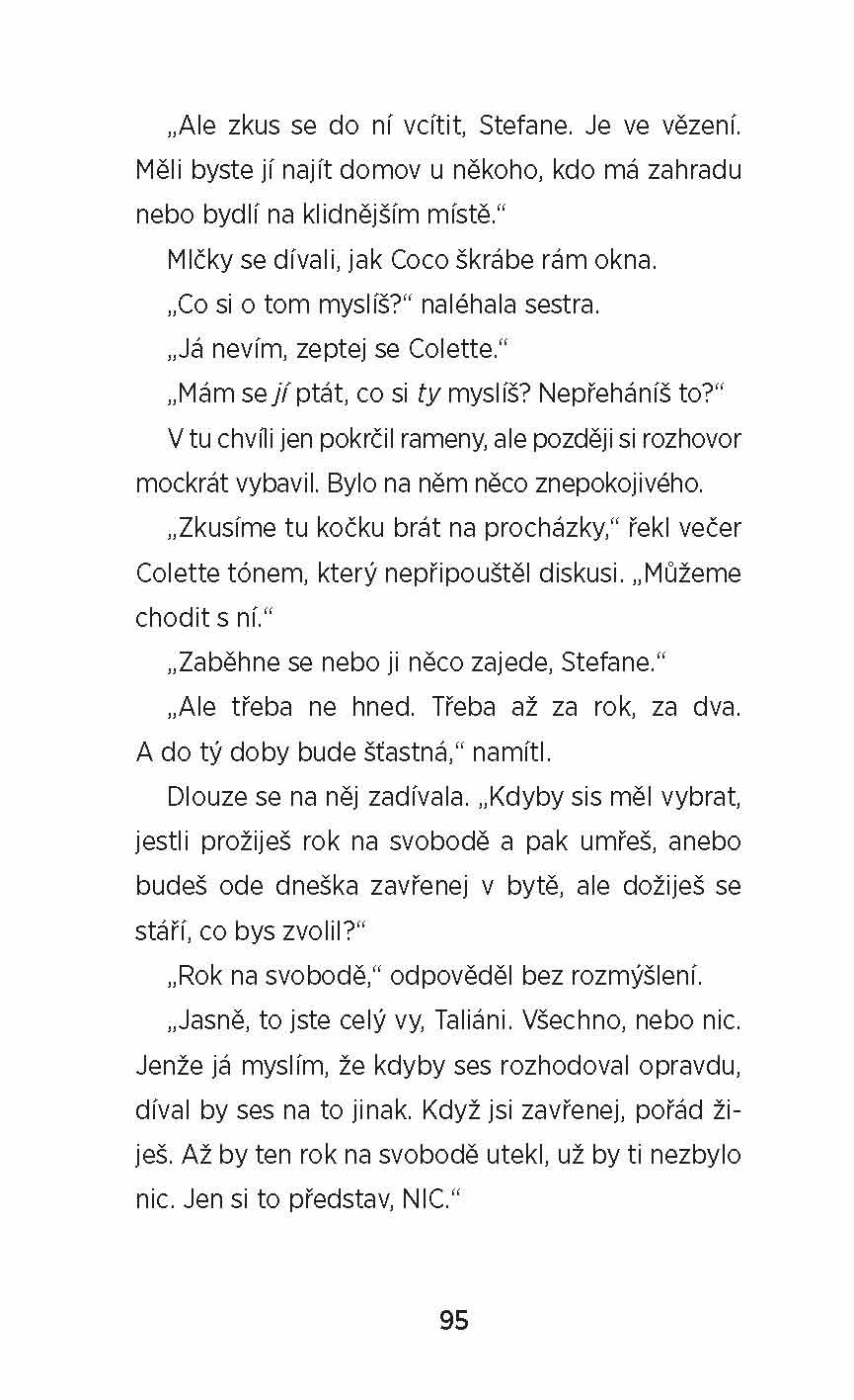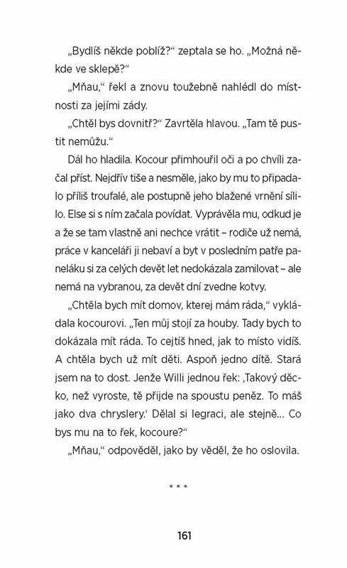 „Říká se, že lidé, kteří nemají rádi kočky, se v příštím životě narodí jako myši. Klevisové to nehrozí, spíš bude tou nejopečovávanější kočičí královnou. Koťata, kočky a kocouři jsou totiž pro ni a její hrdiny středobodem světa, terapeutickým nástrojem, smyslem života, symbolem svobody, terčem laskavosti a hromosvodem láskyplných tendencí...“
