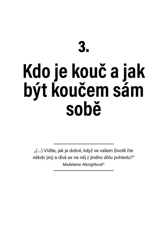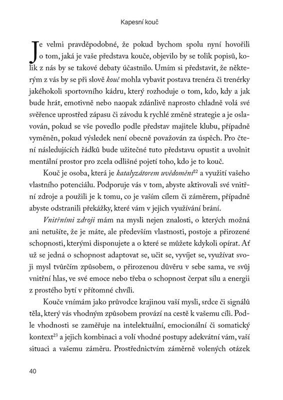 Takového průvodce právě držíte ve svých rukou. Bude vám sloužit jako váš osobní kouč, který vás provede nejrůznějšími životními situacemi s hlubokou vírou, že odpovědi na své otázky máte v sobě. Podpoří vás ve vaší jedinečnosti a schopnosti nalézat řešení v nejrůznějších životních situacích. Používá inspirativní příklady z praxe a bohatou zásobu dobrých otázek. Prostřednictvím praktických technik vás naučí ovládnout umění sebekoučinku, které je užitečnou výbavou pro život. Skryté dispozice pro to být sám sobě koučem má přitom každý z vás, stačí je jen objevit!